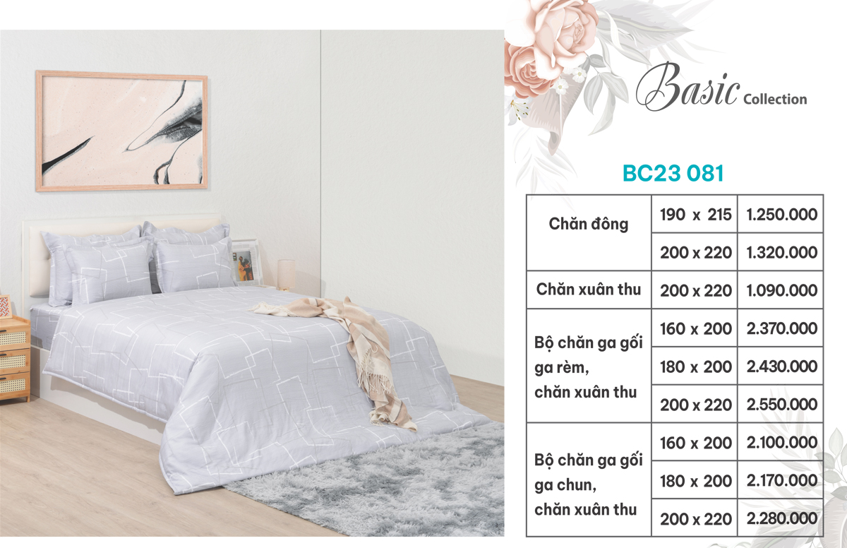 BC23 081 có bảng giá niêm yết của nhà sản xuất dưới đây. Để có giá tốt nhất quý khách vui lòng liên hệ Nhà phân phối chăn ga gối đệm Sông Hồng Đông Á