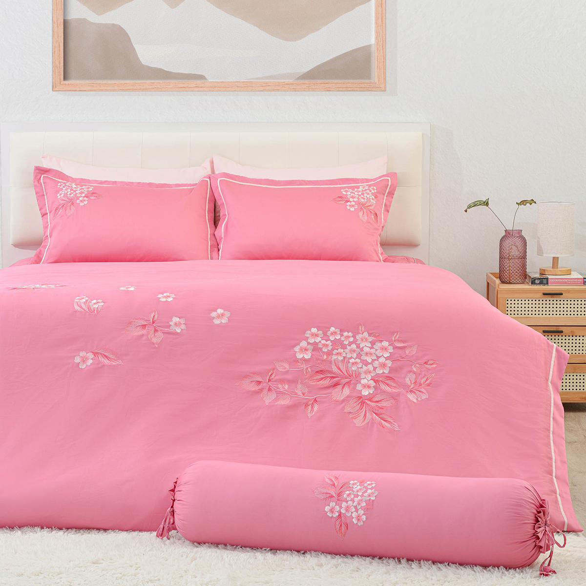 Hoạ tiết: thêu hoa sắc nét trên nền vải màu hống tươi toát lên sự tinh tế, nổi bật và góp phần tạo nên một diện mạo tươi vui, mang không khí tươi mới trong căn phòng.