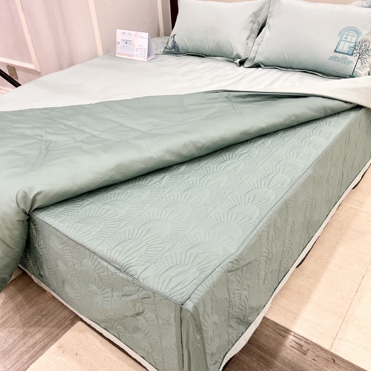 Màu sắc: màu xanh ngọc trang nhã tô điểm nhẹ nhàng cho căn phòng, tạo nét vừa sang trọng, vừa gần gũi, sẵn sàng vỗ về giấc ngủ cho bạn.